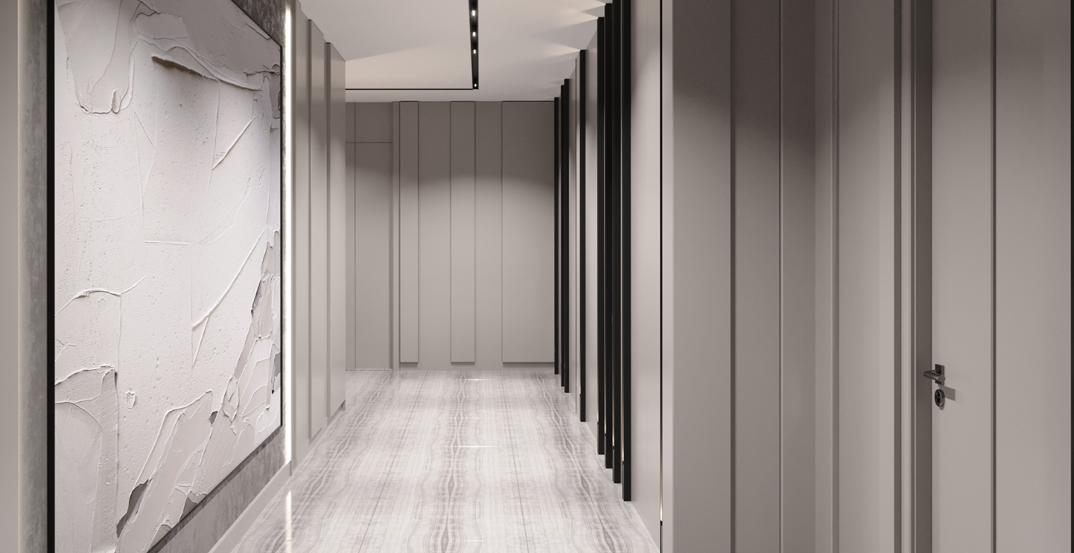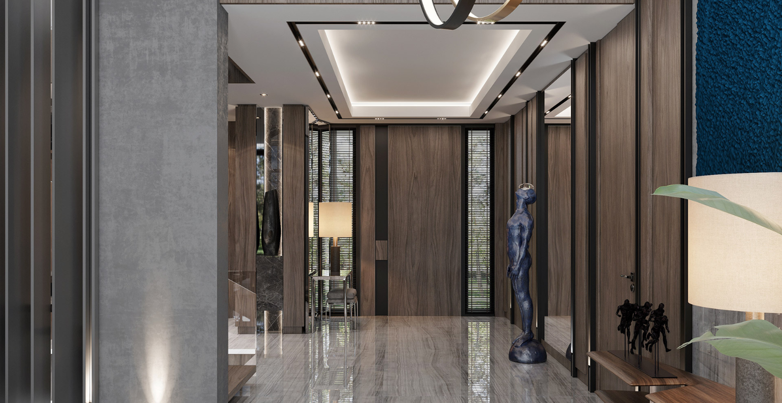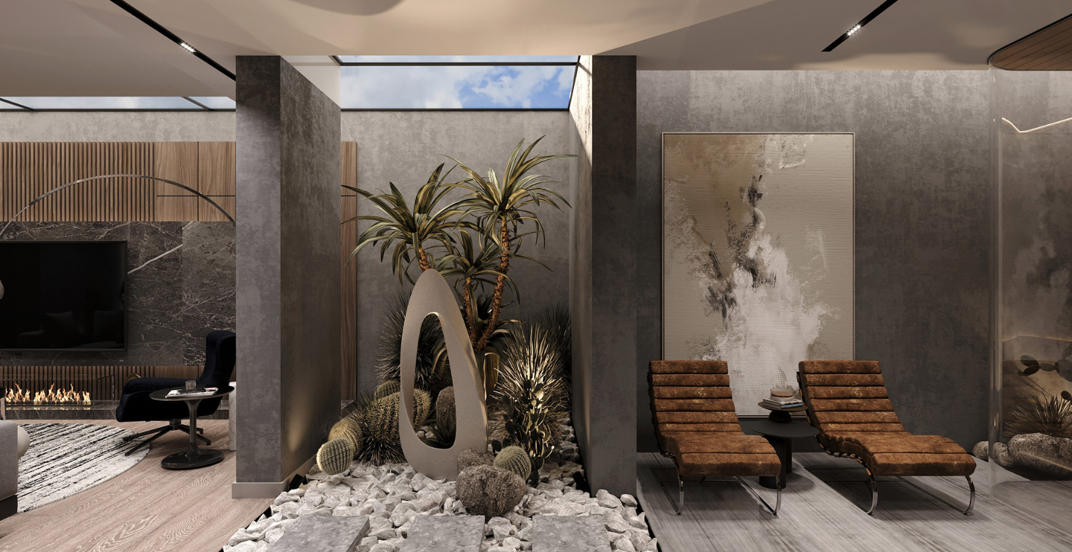 Pandemi sonrası evlerde vazgeçilmez hale gelen ofis-kütüphane odası, süs havuzuna bakacak şekilde tasarlanmıştır. Zemin katta, bahçe manzaralı giriş holü, arka kısımdaki salon ve mutfakla bağlantılıdır. Yapının merkezinde yer alan çatı pencereli merdiven boşluğu, doğal ışığın içeri girmesini sağlar. Üst katta ebeveyn yatak odası ve iki ek yatak odası; alt katta ise iç avlularla aydınlatılan hobi odası, spa/hamam, çamaşır odası ve teknik hacimler yer alır. Tüm katlara asansörle erişim mümkündür. Bodrum kat, en az üç araçlık kapalı otoparka doğrudan bağlantılıdır ve girişte geniş bir vestiyer alanı bulunmaktadır.